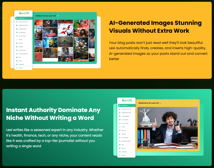 - AI-Powered Blog Writing: Lexi creates high-quality, SEO-optimized content in any niche with zero input from you.